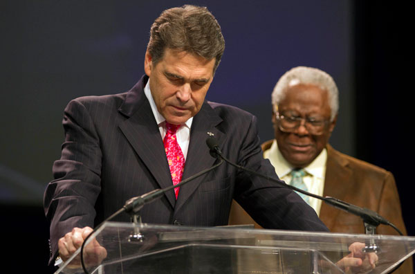 A number of IHOP-KC Staff had got involved in organizing this prayer meeting a number of months back, realizing it was rather unusual (at least in recent history) for a politician to call a day of prayer and fasting. However the ante on this event was certainly upped by the news media when it was revealed that Gov Perry had aspirations of becoming the GOP candidate for the President of the USA. Many thought he would use this platform to reveal or hint at his intentions. I was not among those who believed this, to have done so at a prayer meeting would have been completely inappropriate. I was actually very impressed with what I saw and heard about this Governor. Taking the stage he immediately dispelled the idea that this would be the platform to announce his candidacy by focusing on God “His agenda is not a political agenda. His agenda is a salvation agenda… he followed this with “He is a wise, wise God. And He is wise enough to not be affiliated with any political party.” I have to say I am uncomfortable being in a country where being a Christian is synonymous with being Republican (I really wish polemical issues such as Abortion and Sexual Morality were individual decisions and not based on party politics), but I have to say that I think these comments were very appropriate and classy.